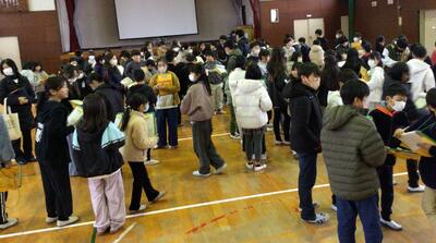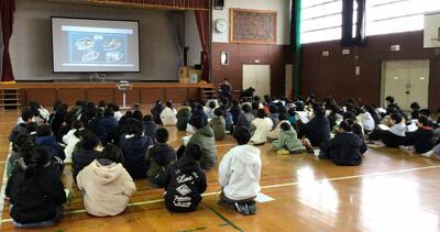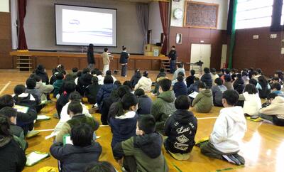 城北校区の4小学校の5年生が余内小学校に集まって、「夢実現講演会」を開催しました。