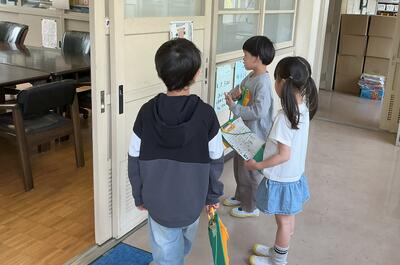 部屋の扉に貼ってある、案内カードを2年生が1年生に読んであげています。
