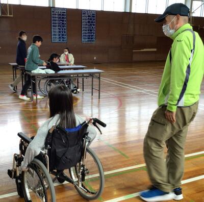 4年生の児童は、実際にアイマスクをつけて階段の上り下りをするなどの体験も行いました。